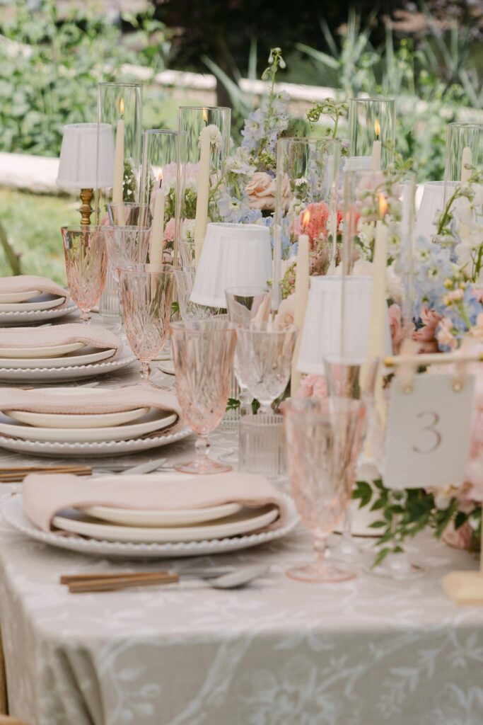 Tent wedding reception filled with spring florals lined down the center of the table.